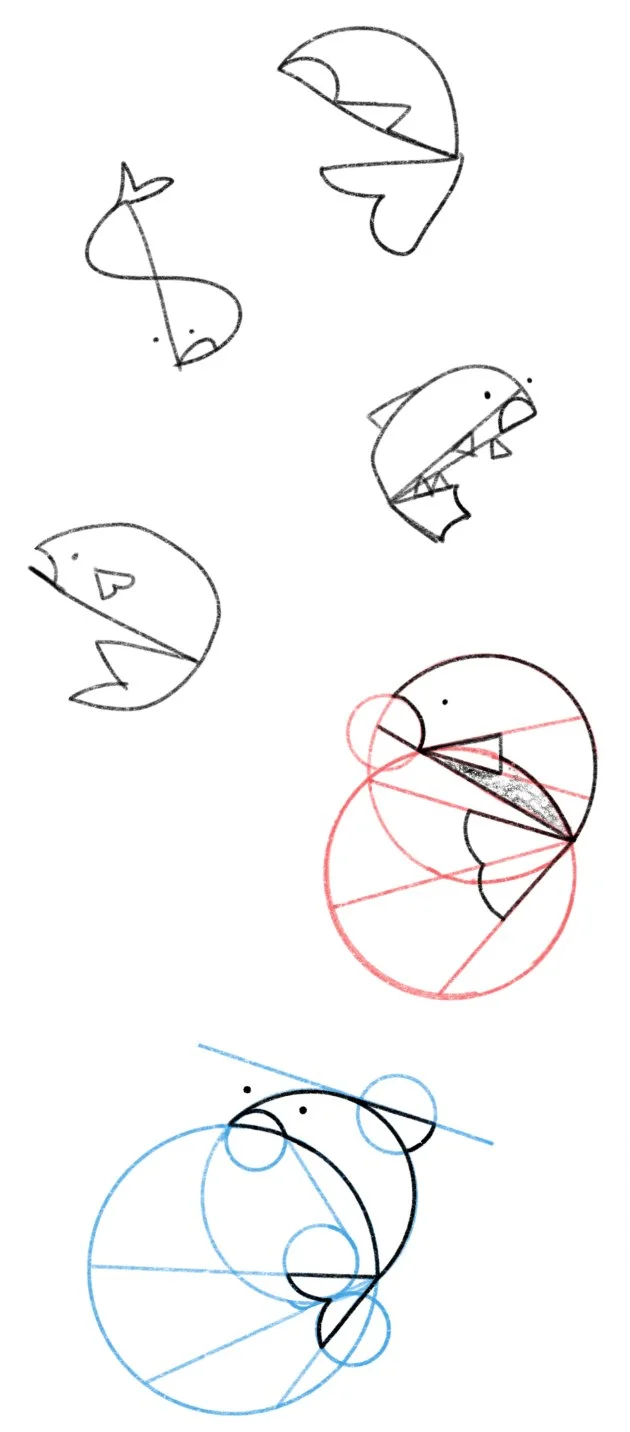 The initial logo design of the project consists of drawing animals (in this case, a fish) using only lines and shapes. Utilizing the connecting points where these shapes come together, you can see where the form of the logo begins to take place, and even add in some small details (like the gills.)